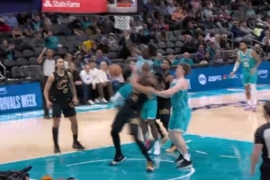 小摩擦!贾勒特·阿伦和迪亚巴特拼抢时发生口角 前者被吹技犯